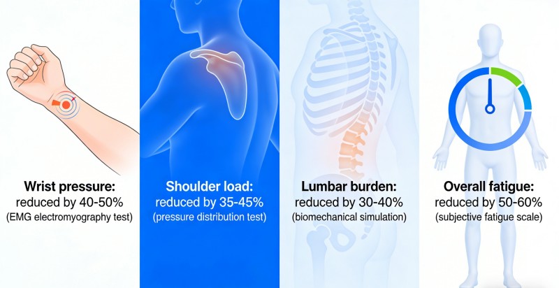 Rischi di deformazione ridotti Pressione del polso: ridotta del 40-50% (test elettromiografia EMG) Carico sulle spalle: ridotto del 35-45% (test sulla distribuzione della pressione) Carico sulla parte bassa della schiena: ridotto del 30-40% (simulazione biomeccanica) Fatica complessiva: ridotta del 50-60% (scala soggettiva della fatica)