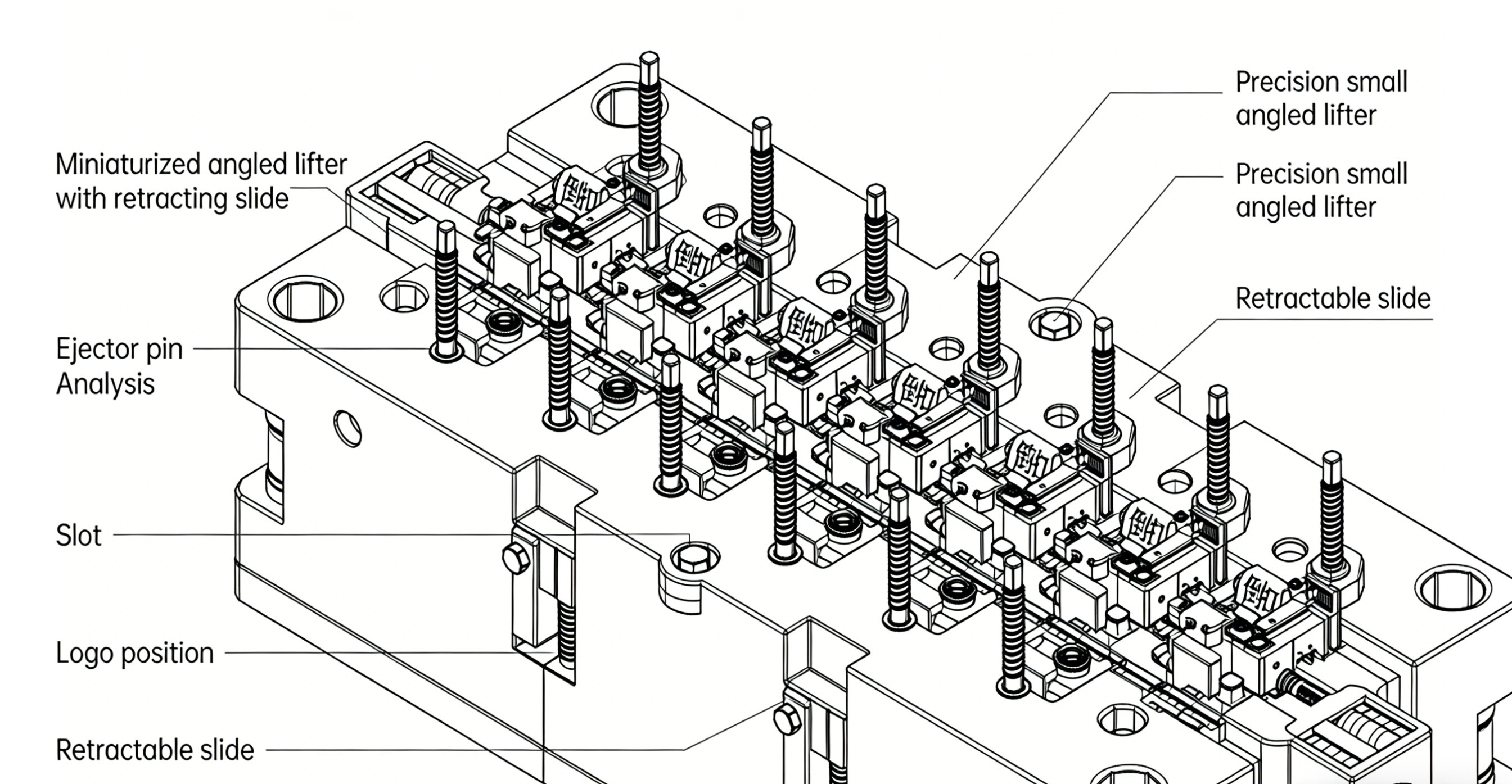 La sfida: l'interno è dotato di chiusure del vano batteria densamente popolate, perni di posizionamento PCB e meccanismi di slot decorativi, che creano strutture complesse soggette a segni di bava, deformazione o graffi durante la sformatura. Soluzione: progettare un meccanismo combinato "espulsore micro-conico multigruppo e cursore retrattile". Gli espulsori micro-conici compatti e di precisione affrontano i sottosquadri e le nervature interni densi. Per le fessure laterali o le posizioni del logo, le guide retrattili garantiscono un'espulsione fluida senza danni al prodotto. La disposizione dei perni dell'espulsore è sottoposta ad analisi delle sollecitazioni per garantire un'espulsione fluida e bilanciata.
